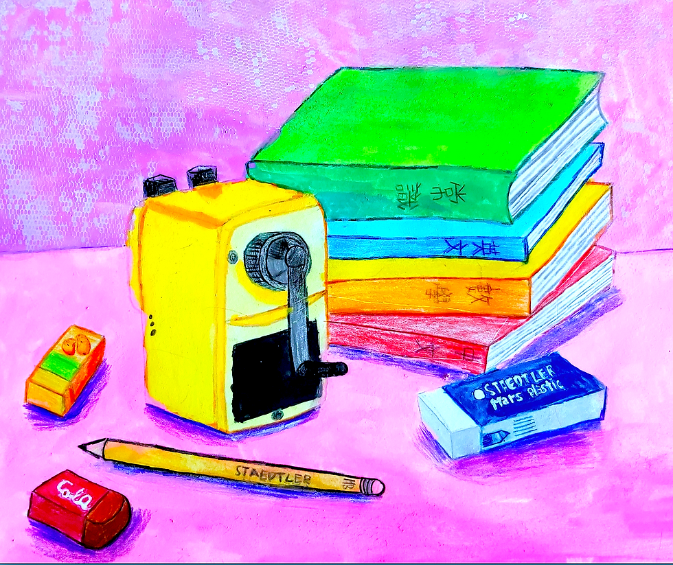 Sketching pencil, charcoal, soft pastel, soft pastel pencil, oil pastel, designer marker, ink, poster color, colored pencil, watercolor pencil, acrylic paint, oil paint, clay, wood, craft material...etc.